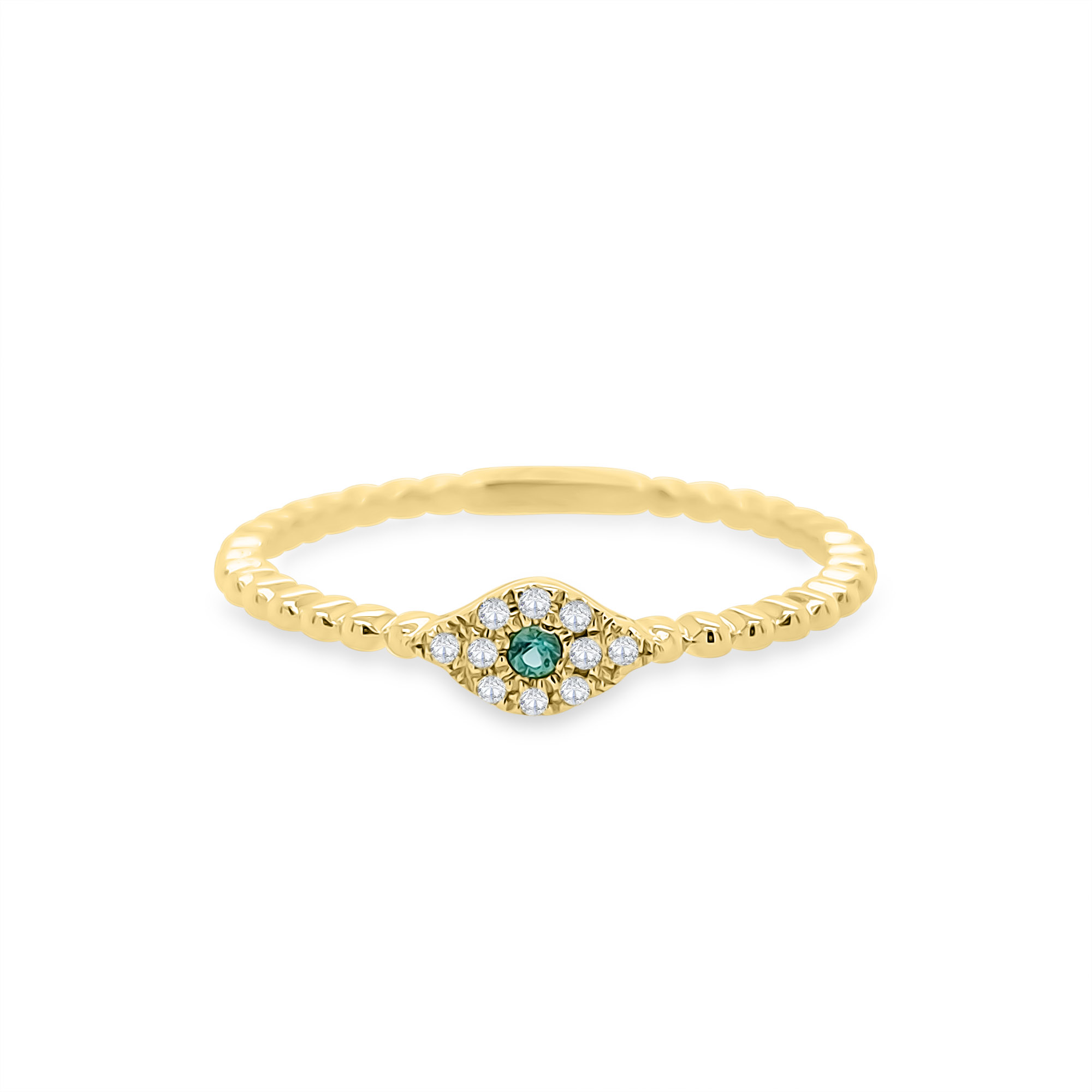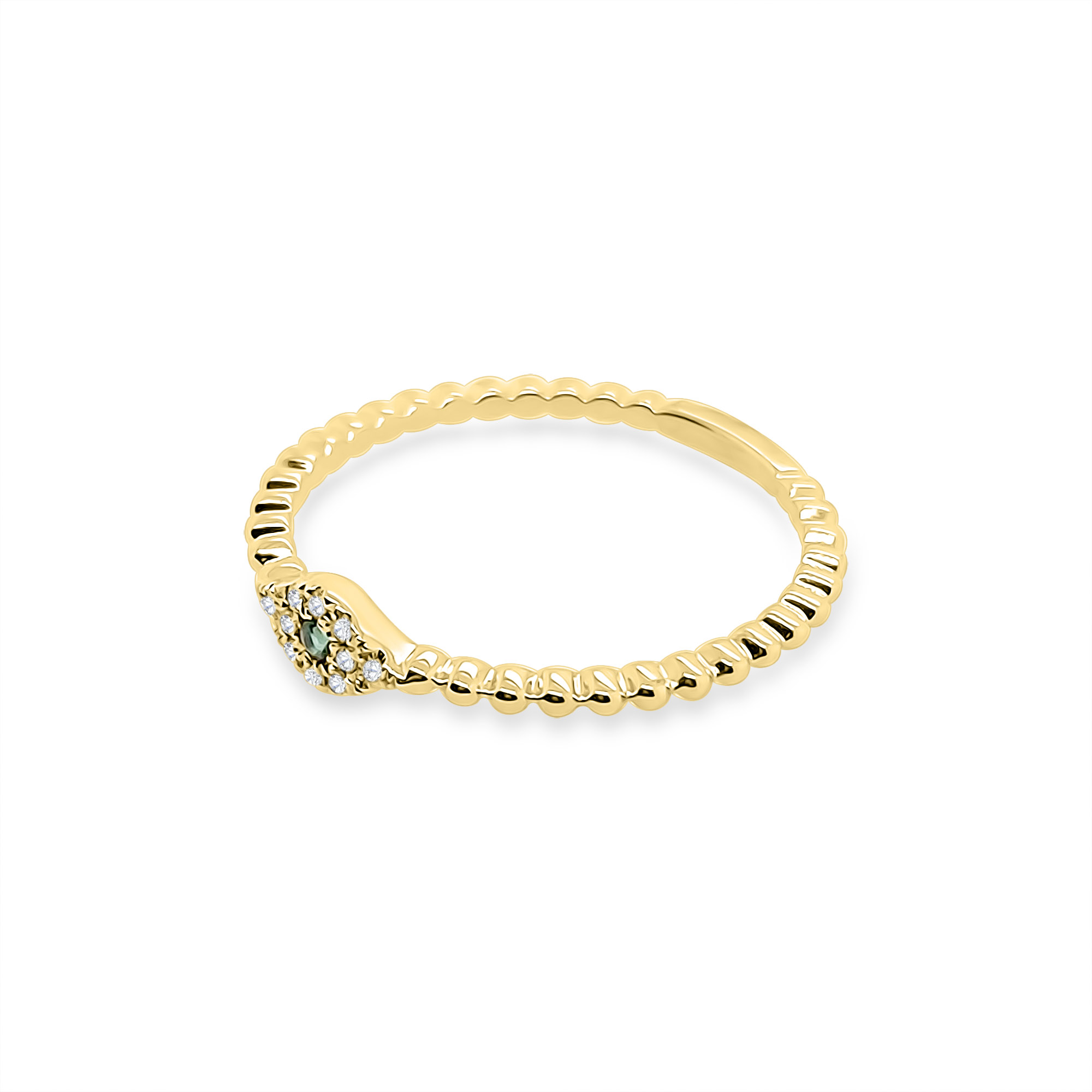 One Diamond and Emerald Evil Eye Ring crafted in 14k yellow gold set with diamonds totaling 0.03ct and one emerald totaling 0.01ct.