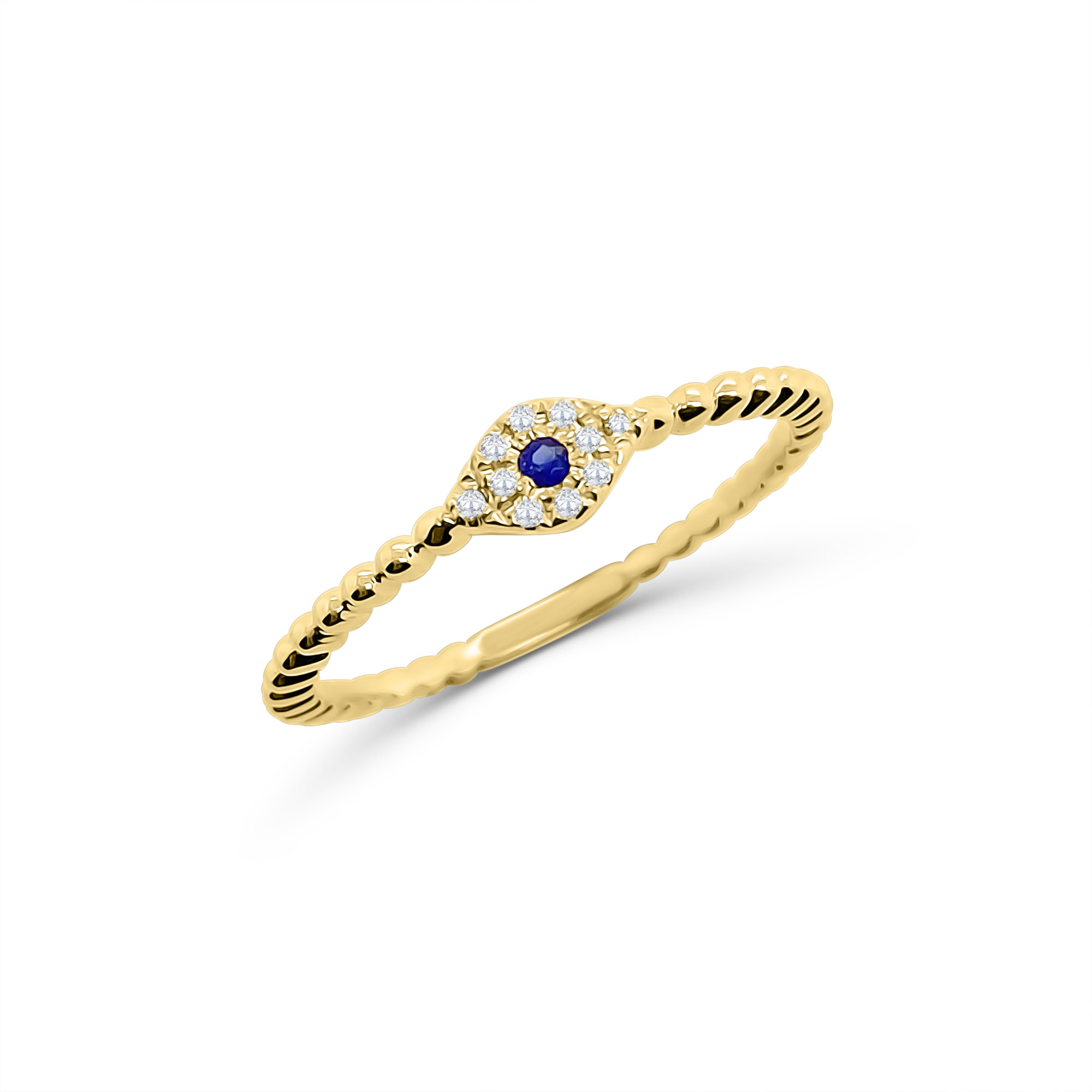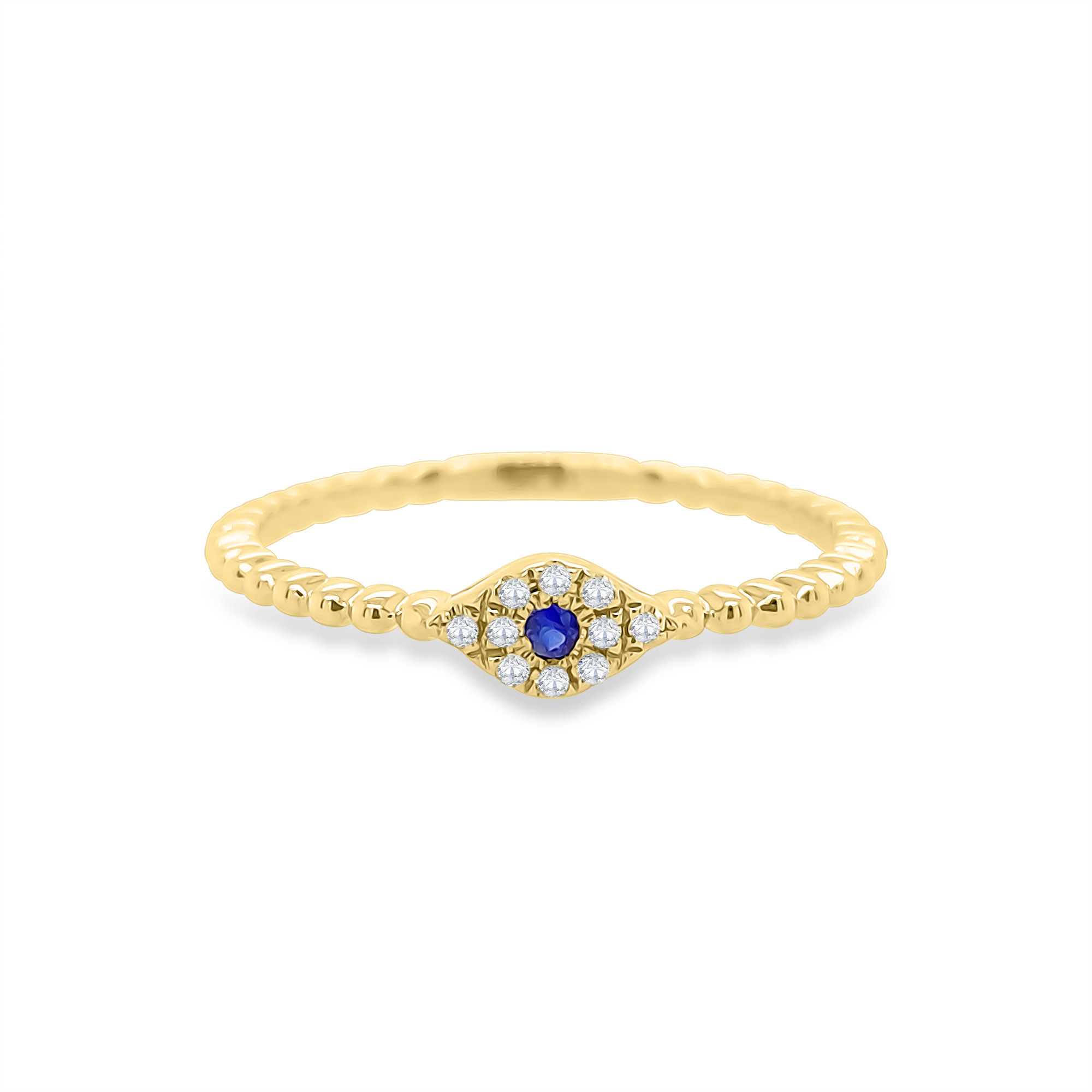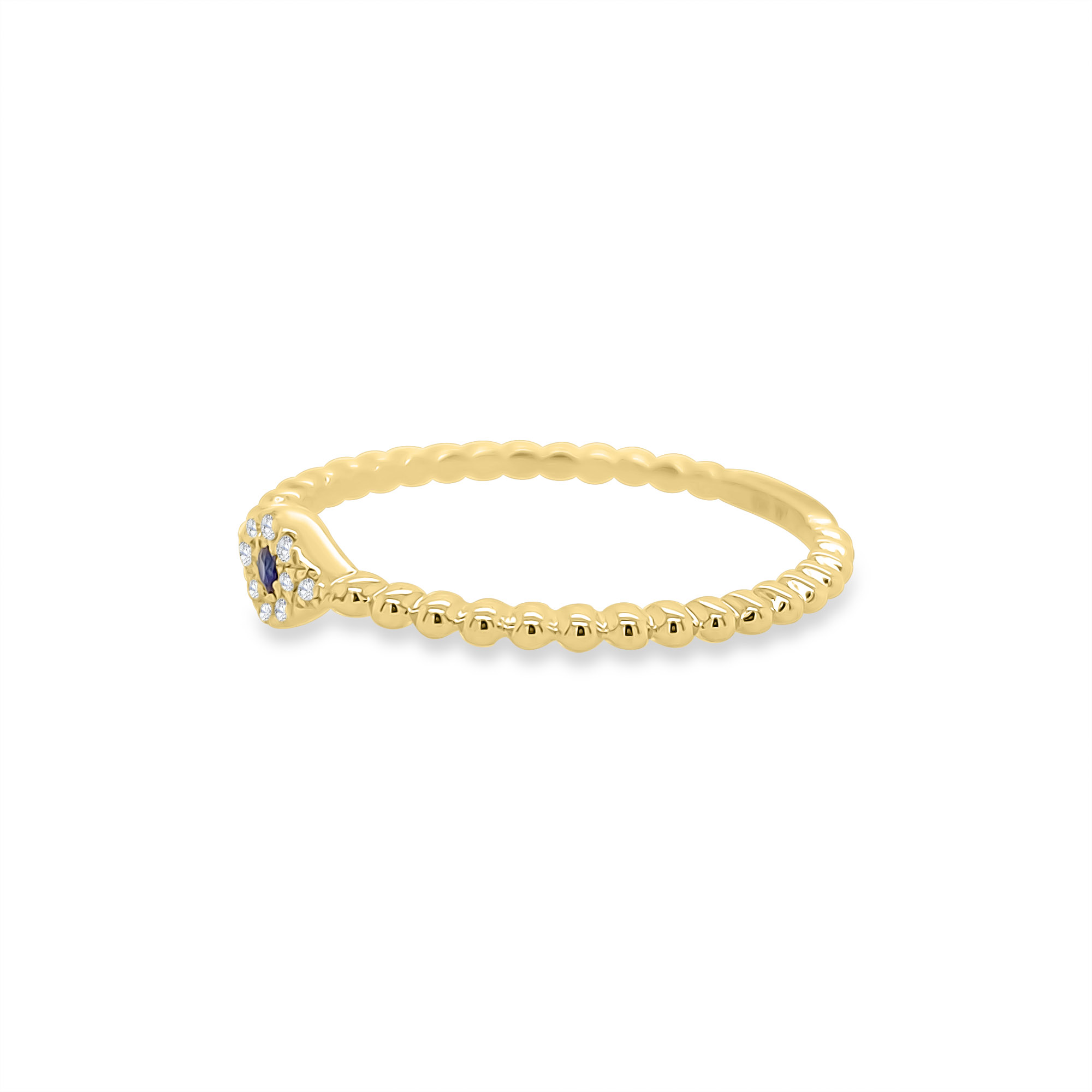 | One Diamond and Sapphire Evil Eye crafted in 14k yellow gold set with diamonds totaling 0.03ct and one sapphire totaling 0.02ct. 14k Yellow Gold Diamond Carat- 0.03ct Sapphire Carat- 0.02ct Total Weight- 1.2g Size- 7 (can be sized upon request with no additional fee) |