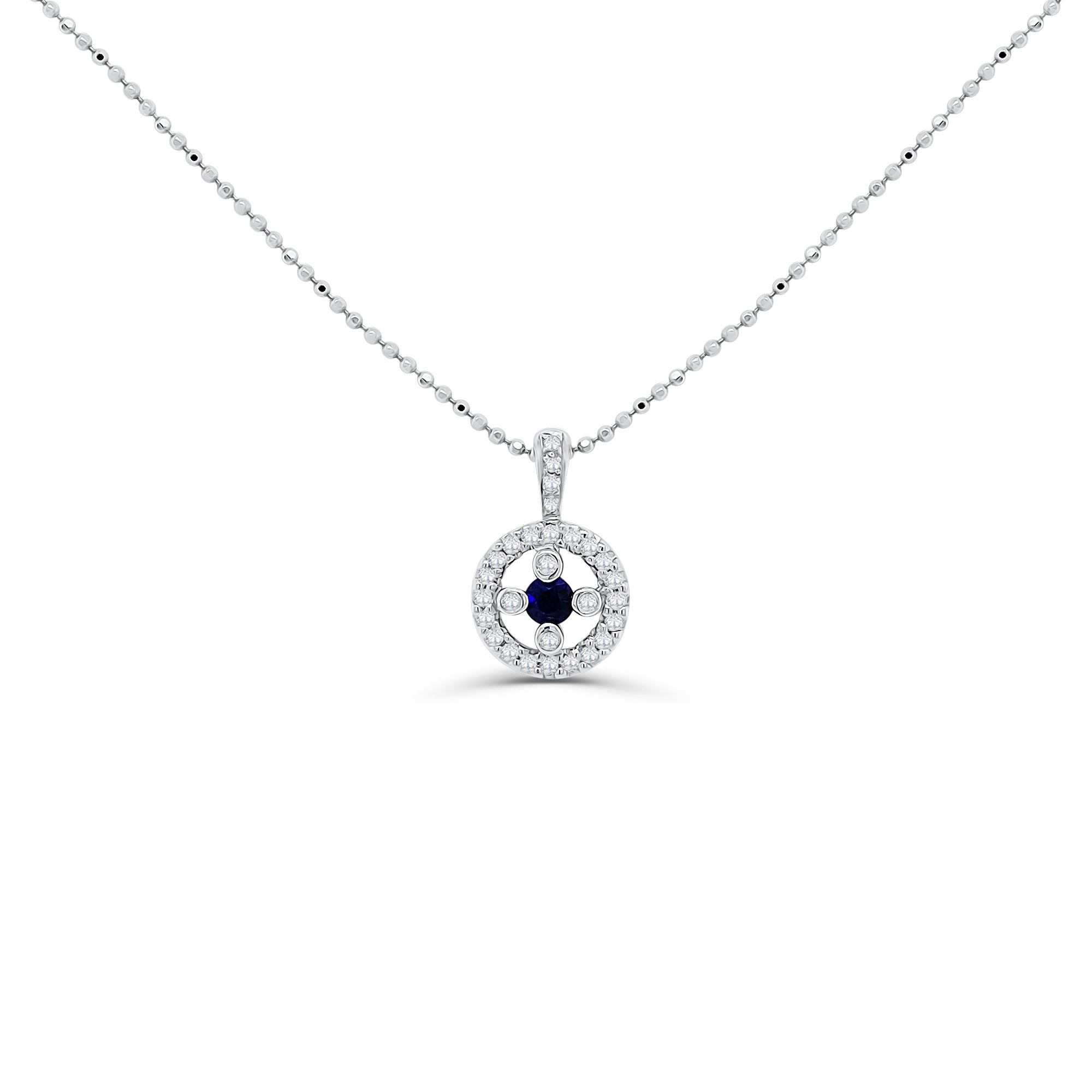| One Diamond and Sapphire Pendant crafted in 18k white gold set with diamonds totaling 0.15ct and sapphires totaling 0.15ct. 14K White Gold Diamond Carat- 0.15ct Sapphire Carat- 0.15ct Total Weight- 2.8g Length of Chain- 15.5in. |