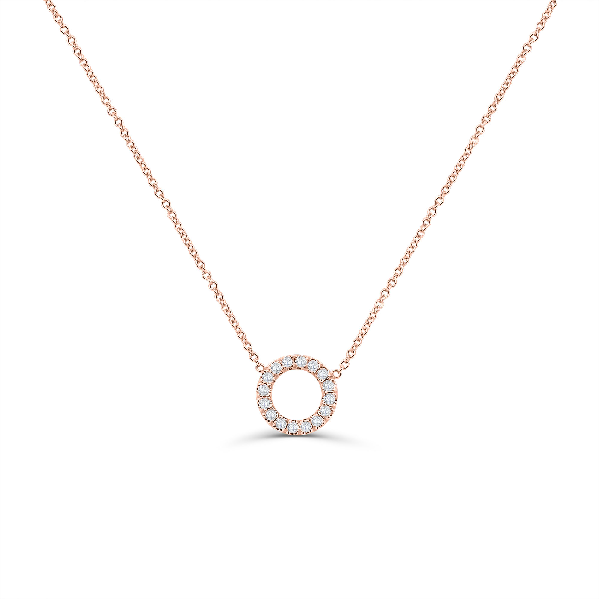 Diamond Eternity Circle Necklace crafted in 14 karat rose gold set with diamonds totaling 0.19 carats. 14K Rose Gold Diamond Carat- 0.19ct Total Weight- 1.3g Length of Chain- 16in.