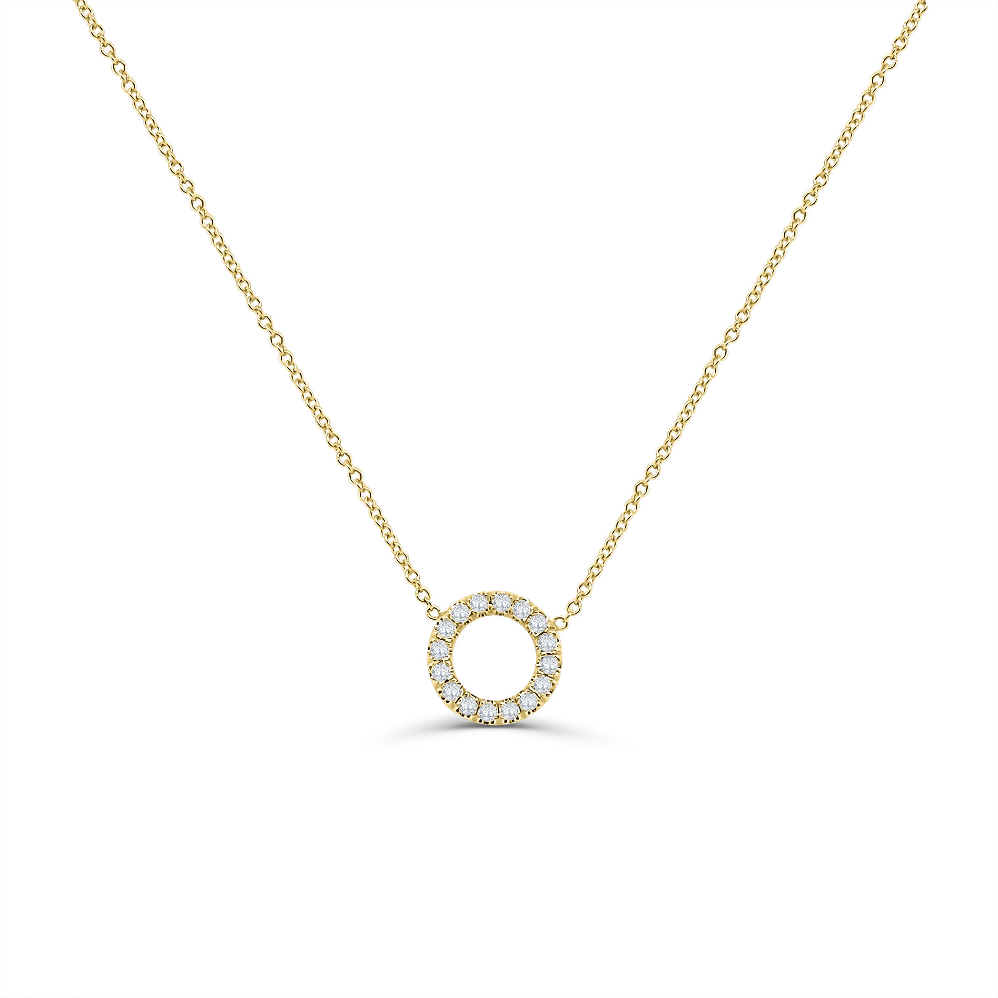 Diamond Eternity Circle Necklace crafted in 14 karat yellow gold set with diamonds totaling 0.19 carats.