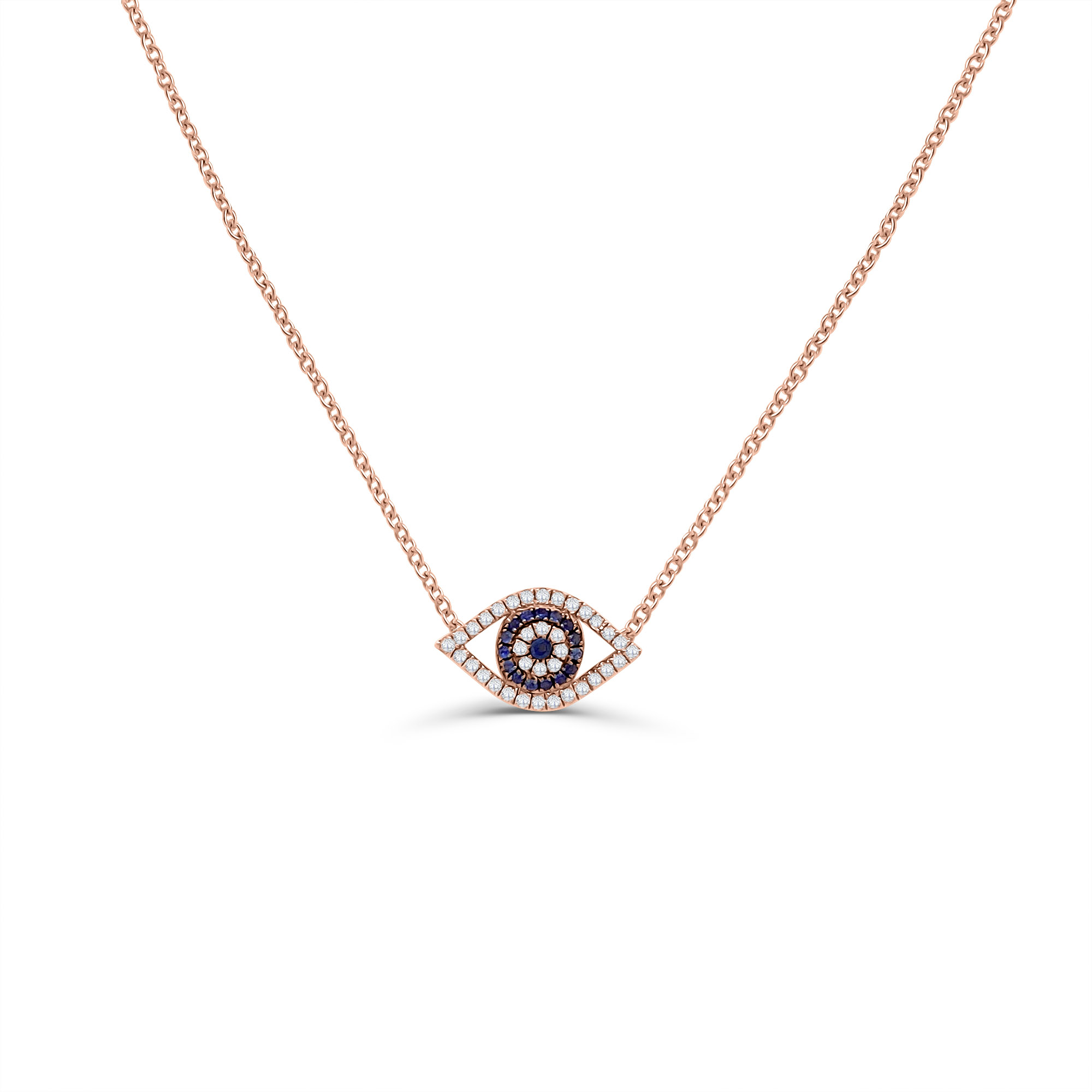 Medium Evil Eye Necklace crafted in 14k Rose Gold set diamonds totaling 0.15ct and sapphires totaling 0.09ct.