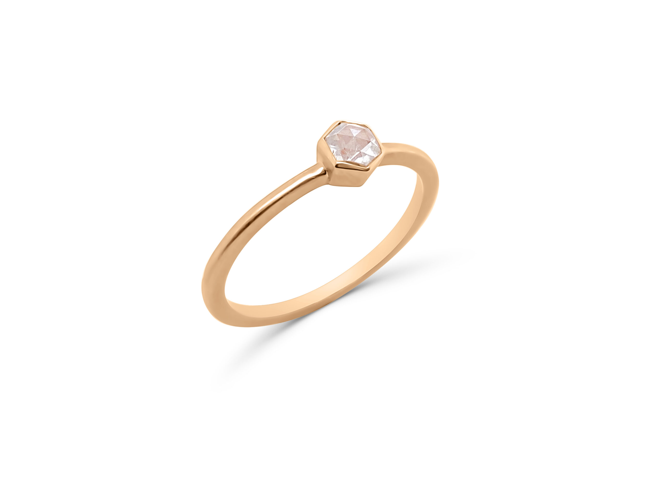 Octagon Rose Cut Diamond Ring crafted in 14 karat rose gold set with a octagon cut diamond totaling 0.17 carats. 14K Rose Gold Diamond Carat - 0.17ct Size - 5.5 (can be sized upon request with no additional fee) Total Weight - 1.4g